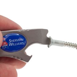Take care of quick fixes anywhere with this seven function multitool keyring. Measuring 3.75" x 1", this high grade stainless steel accessory fits in your pocket and features two flat screwdrivers, Phillips screwdriver, pry bar, bottle opener, wire stripper and a hole for a lanyard, carabiner clip or chain. It's a great giveaway for contractors construction workers, home improvement and DIY activities and events. It has a handsome silver tone with a full color poly dome accent that shows off your logo or message.